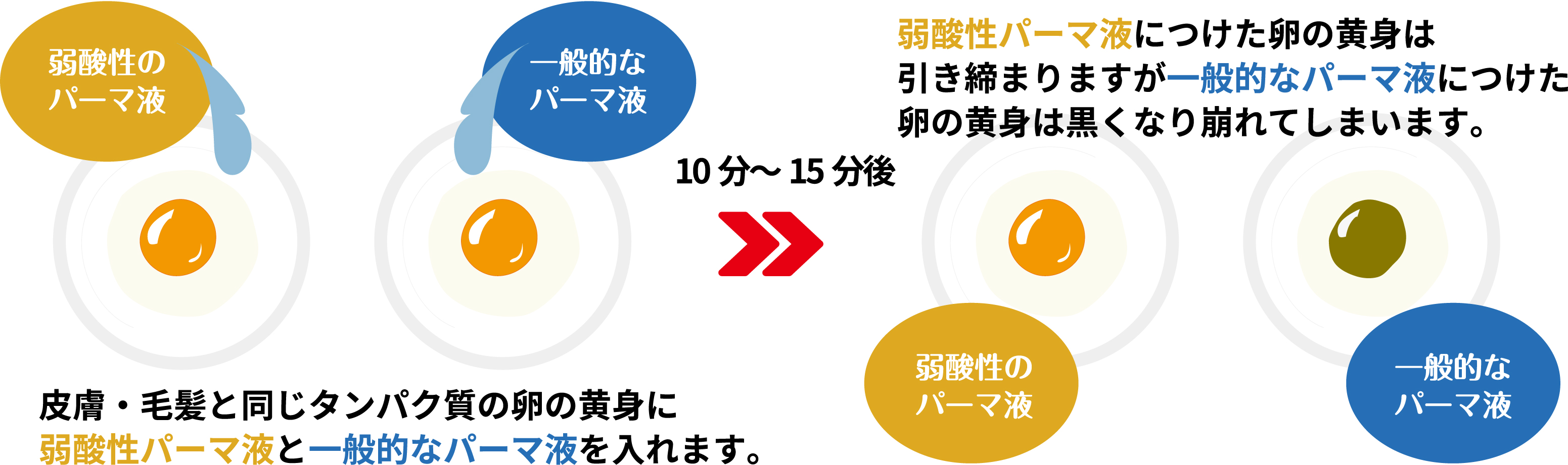 一般的なパーマ液は、アルカリ性。アルカリ性には皮膚や髪のタンパク質を壊す化学的性質がある。だから、皮膚や髪を傷めないでパーマをかけるには、その反対の性質の弱酸性がベストなのです。